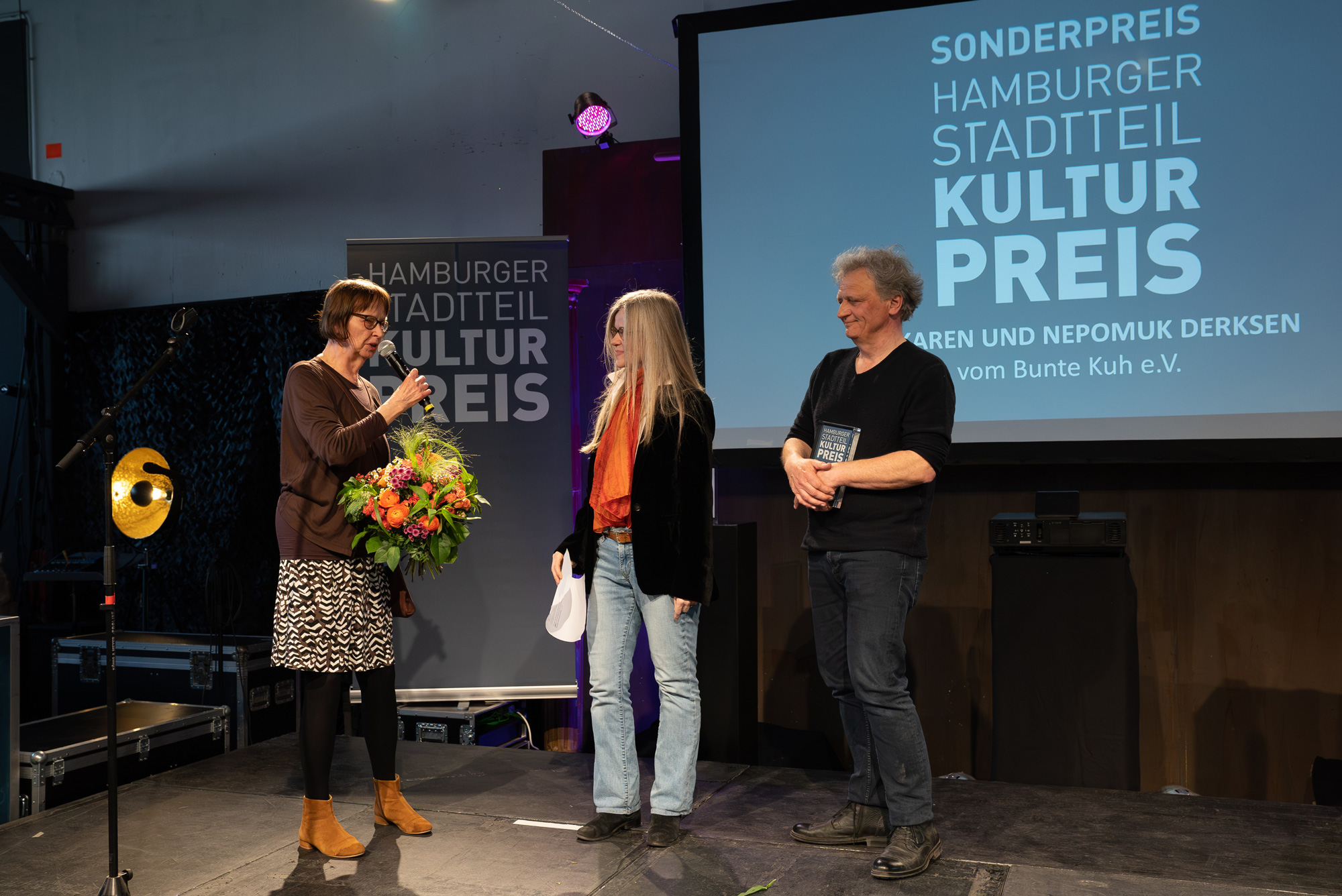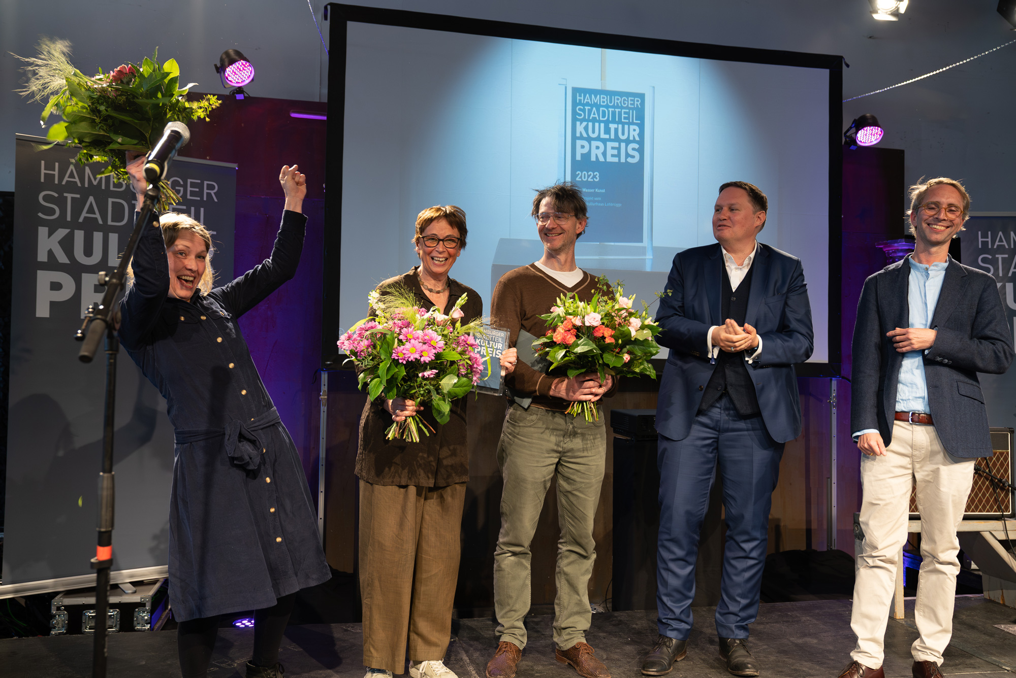 Die Autorin und Slampoetin Mona Harry führte mit ein paar Slameinlagen durch die Veranstaltung und die Band Valentine & The True Believers, die auch bei der Verleihung des Stadtteilkulturpreises 2014 – der ersten von STADTKULTUR organisierten Verleihung – auf der Bühne war, begleitete den Abend musikalisch. Die Geschäftsführerin Corinne Eichner von STADTKULTUR blickte gemeinsam mit Werner Frömming, dem „Erfinder“ des Preises und Organisator der ersten zehn Jahre, auf 20 Verleihungen zurück. Von der Jury wurden Karen und Nepomuk Derksen vom Bunte Kuh e.V. mit dem diesjährigen Sonderpreis ausgezeichnet. Der mit 10.000 Euro dotierte Hamburger Stadtteilkulturpreis wurde vom Senator für Kultur und Medien Dr. Carsten Brosda an das Projekt „Wasser Kunst – partizipatives Kunstprojekt für Kinder und Jugendliche“ des KIKU Kinderkulturhauses übergeben. Prof. Dr. Julius Heinicke, Direktor des Instituts für Kulturpolitik an der Universität Hildesheim, hielt die Laudatio. Zusammen mit der ehemaligen Direktorin der Bücherhallen Hamburg Hella Schwemer-Martienßen und Jennifer Tharr vom Bundesverband Soziokultur hatte er die Preisträger*innen aus der Vorauswahl der Preisstifter*innen ermittelt. Ein Kurzfilm des Filmemachers Martin D’Costa stellte das Gewinnerprojekt des Stadtteilkulturpreises vor. Zum Abschluss gab es Meet&Greet mit Getränk und veganen Häppchen am Wasser auf dem rückwärtigen Gelände der Halle 424. War wieder schööön!