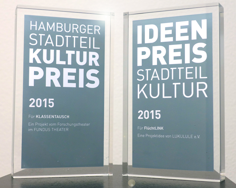 Am 19. Mai werden zum zwölften Mal der HAMBURGER STADTTEILKULTURPREIS und zum zweiten Mal der IDEENPREIS STADTTEILKULTUR verliehen. Mit diesen Preisen sollen wegweisende Projekte der lokalen Kultur in Hamburg gewürdigt werden. Mit dem Hamburger Stadtteilkulturpreis 2015 wird KLASSENTAUSCH, ein Projekt des Forschungstheaters im FUNDUS THEATER, ausgezeichnet. Der Ideenpreis Stadtteilkultur 2015 geht an FlüchtLINK, eine Projektidee des LUKULULE e.V.