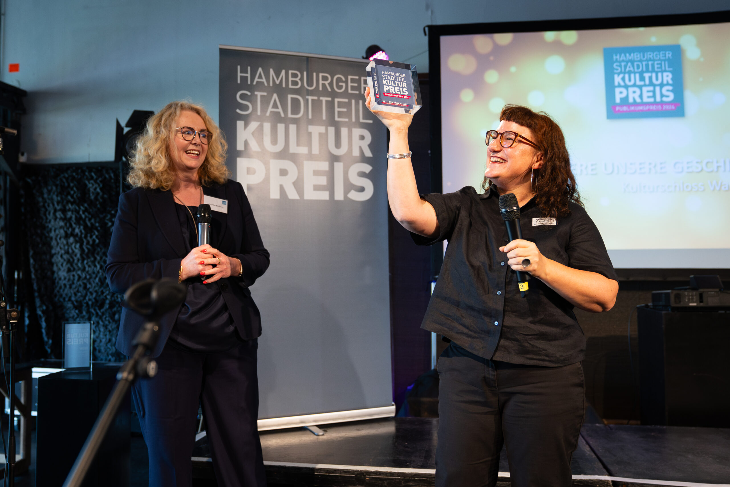 Ainhoa Montoya Arteabaro (r.) nahm von der Geschäftsführer*in von STADTKULTUR, Corinne Eichner, für das Kulturschloss Wandsbek den Publikumspreis entgegen, Foto: Judith Zastrow
