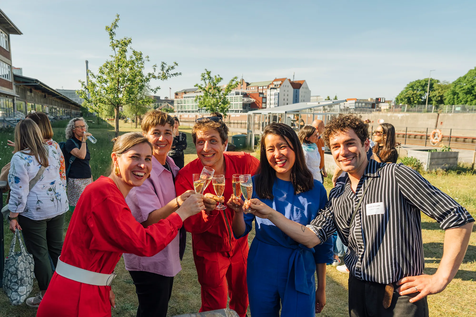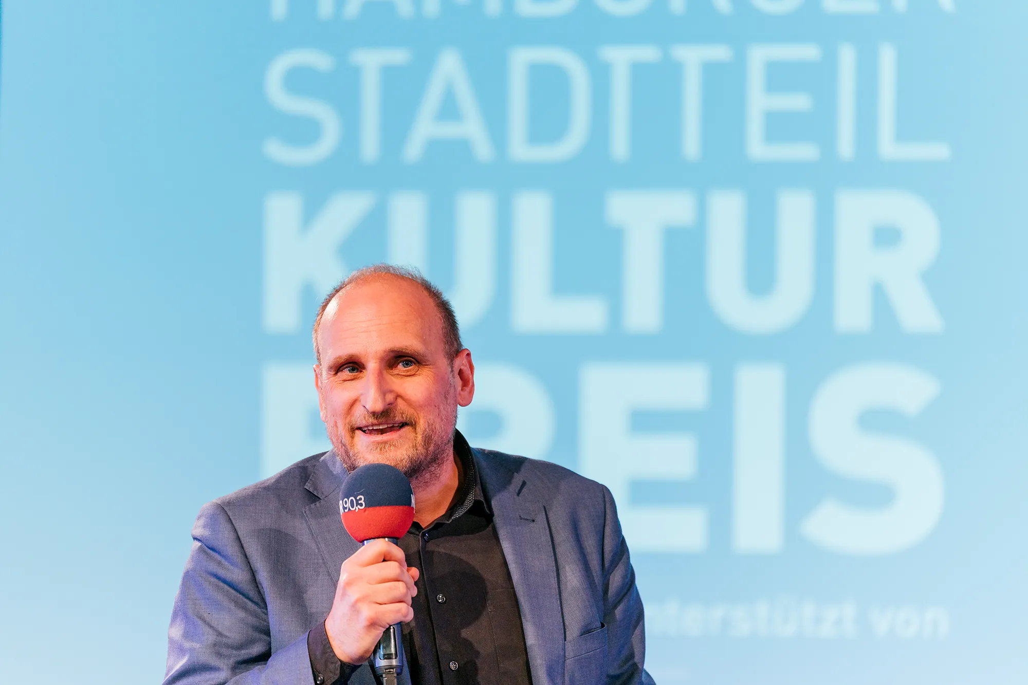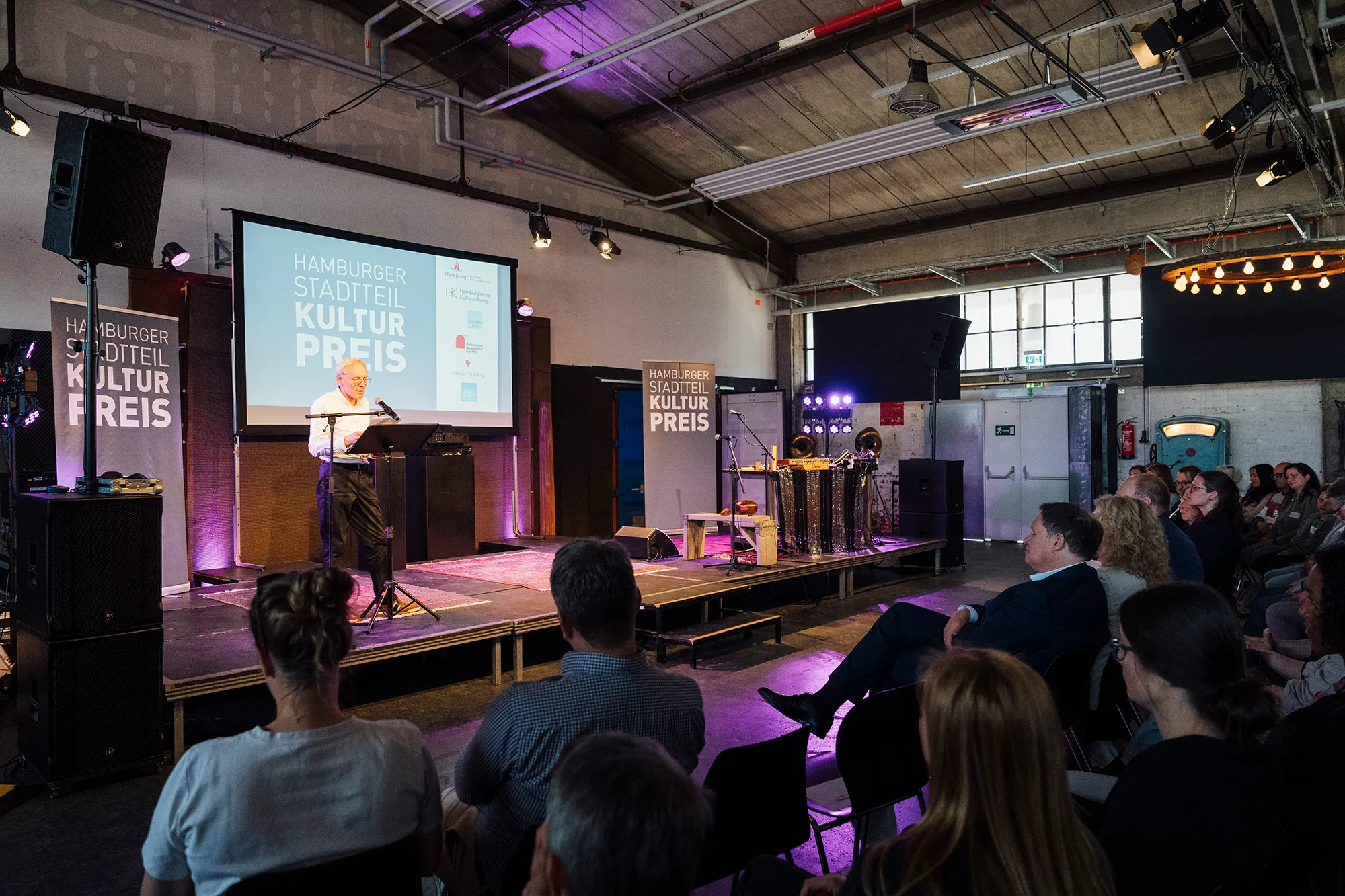 Kultursenator Dr. Carsten Brosda überbrachte ein Grußwort, die musikalische Begleitung kam von Elektro-Duo Guzzi & Scuzzo und durch die Veranstaltung führte Daniel Kaiser von NDR 90,3. Der Juror Klaus Kolb trug die Begründung der Jury vor und übergab den Preis an KLIMASTRÖME. Zusammen mit Jennifer Tharr von der DROSOS STIFTUNG und Prof. Dr. Julius Heinicke, Direktor des Instituts für Kulturpolitik an der Universität Hildesheim, hatte er die Preisträger*innen aus der Vorauswahl der Preisstifter*innen ermittelt. Ein Kurzfilm des Filmemachers Martin D’Costa stellte das Gewinnerprojekt des Stadtteilkulturpreises vor. Zum Abschluss gab es Meet&Greet mit Getränk und veganen Häppchen am Wasser auf dem rückwärtigen Gelände der Halle 424. War wieder schööön!