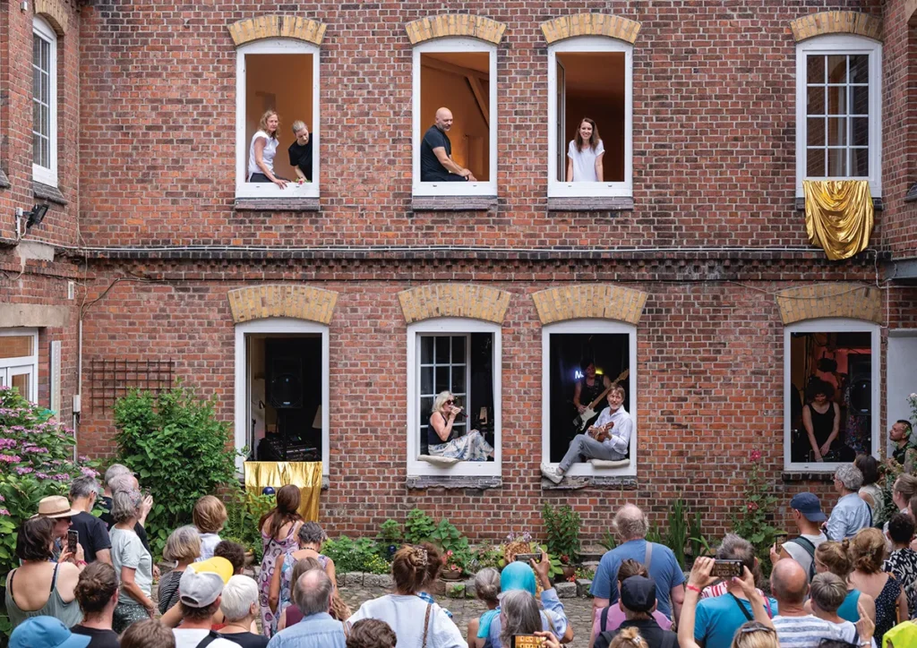 Bei ALTONA MACHT AUF! gehen die Fenster des Stadtteils auf, die Balkontüren öffnen sich, die Bewohner*innen treten aus der Anonymität heraus. Sie inszenieren ihre Sehnsüchte, ihre Vorstellungen von der Zukunft ihres Stadtteils mit den Mitteln der performativen Künste und geben dem Ausdruck, was im Alltag hinter der Fassade bleibt – sie geben Altona ihr Gesicht.