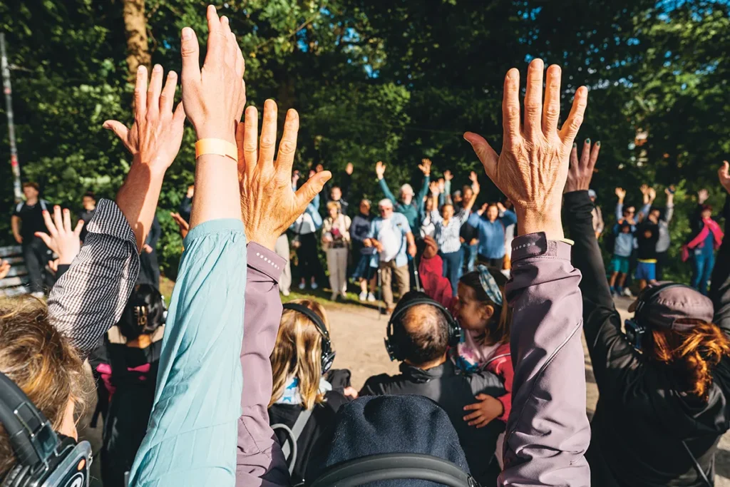 Die Schüler*innen haben Personen aus dem Stadtteil kennengelernt, haben deren individuellen Wege nach Bahrenfeld beforscht, ihre Lieblingsorte, aber auch Orte mit Geschichte besucht und sich von den vielen Stimmen inspirieren lassen. Entstanden ist ein Audio-Walk durch den Lutherpark, der private Balkone, öffentliche Wiesen und Wege, eine Kirche, die Gedenkstätte und das Parkcafé der Seniorenresidenz bespielte und fast 500 Schüler*innen beteiligte: mit Erzählungen, Fahnen, Reden, Podcasts, Szenen, Choreografien und Musik.